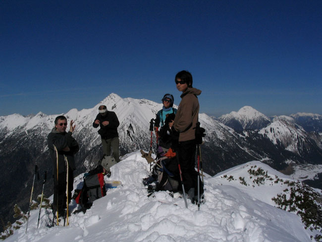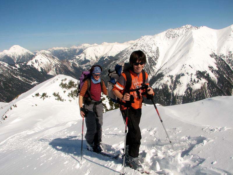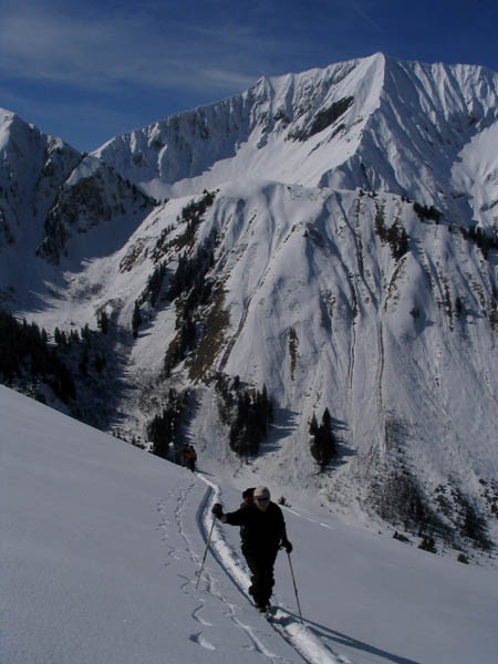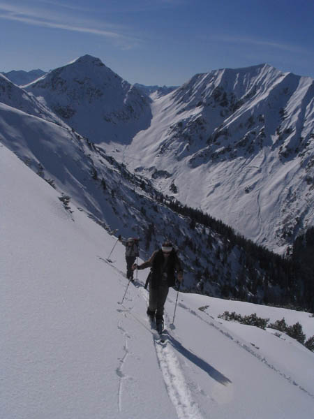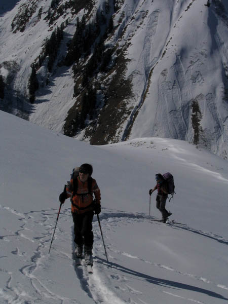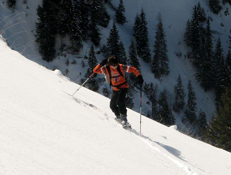 Zuerst hab ich etwas Bedenken, wie Simon das schafft, Jean und manni trampeln gute Kante in den harschdeckel und dann Lerning by Doing nach dem Steilhang passt´s mit der Spitzkehrentechik schon sehr gut