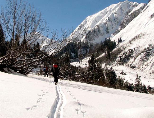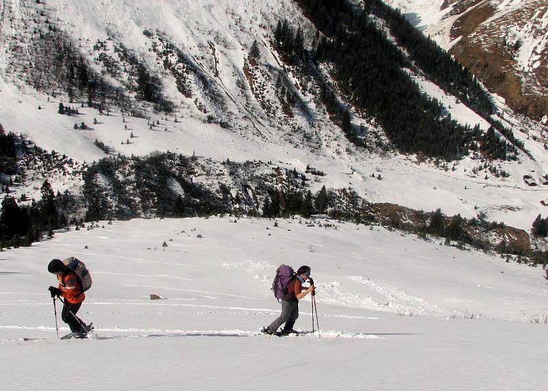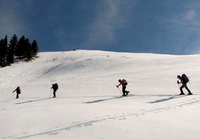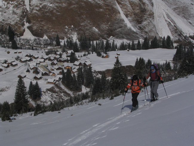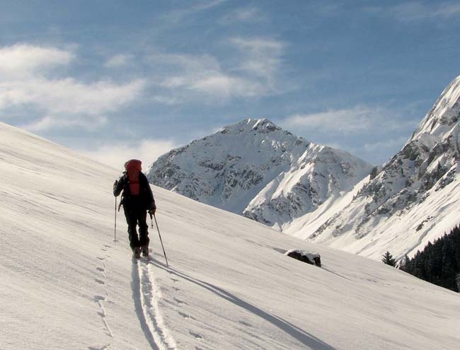 10.März 2007 Wieder mal auf so einen einen Lechtaler Bichl. Am Vortag am Kalten Stein einen durchaus brauchbaren Untergrund ab 1500M festgestellt. Wegen Grasuntergrund ist weiter unten auch der dünnste Sockel ausreichend, der steile Grashang in der Mitte ist nicht abgerutscht und hat deswegen mehr Schnee als in anderen Jahren. Simon erlebt seine Feuertaufe mit steileren Spitzkehren und schlägt sich ausgezeichnet.
