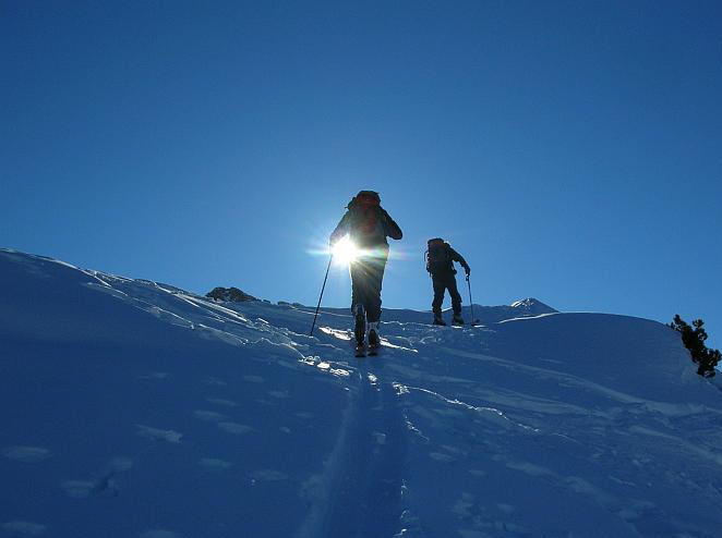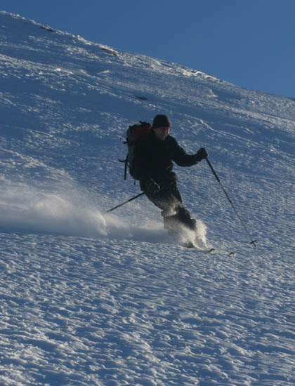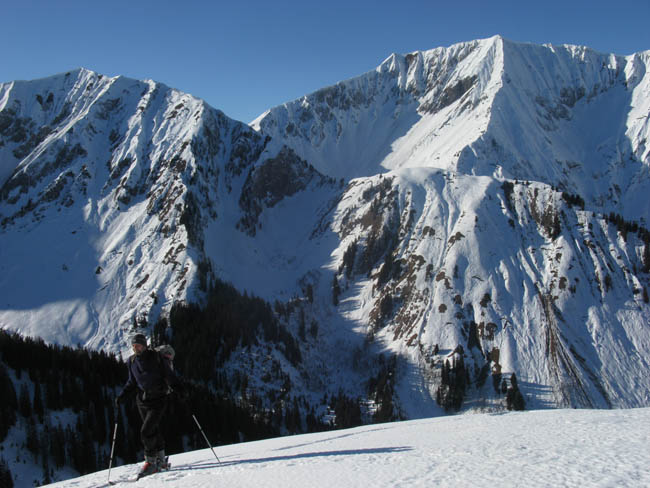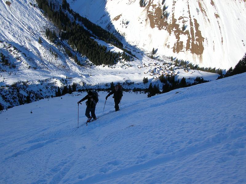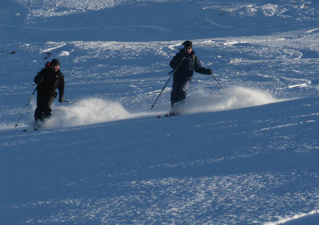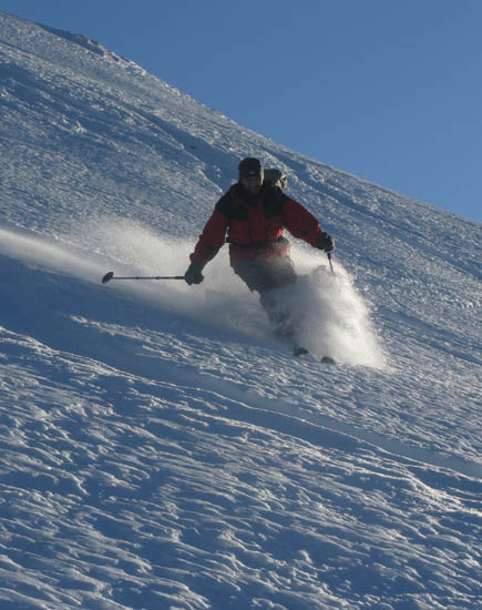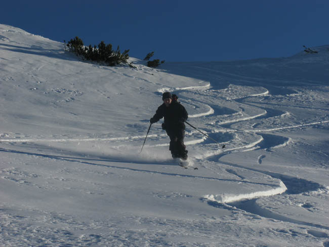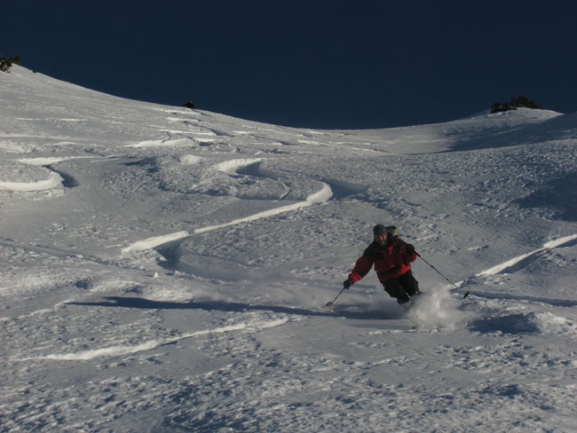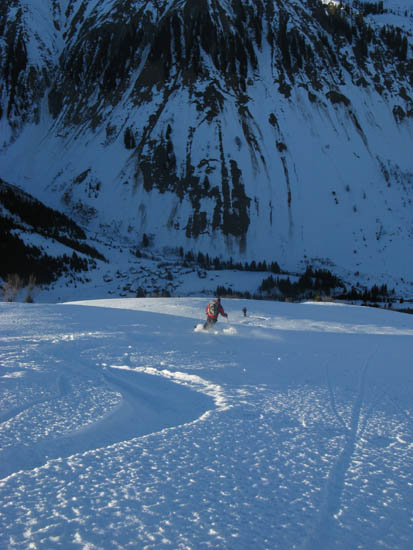 29.12.07 alle gut erreichbaren Touren ziemlich verspurt, also lieber auf einen unscheinbaren Bichl. Dort war aber schon der Dieter, so haben wir uns erst noch am Nordostseitieg Kar rumgetrieben, bevor wir dann noch genügend freie Hänge auf der westseite gepflügt haben, und das mit schönem Fotolicht.