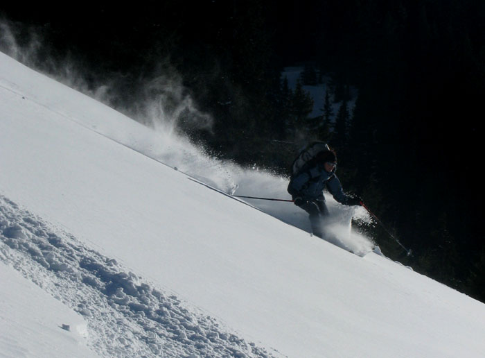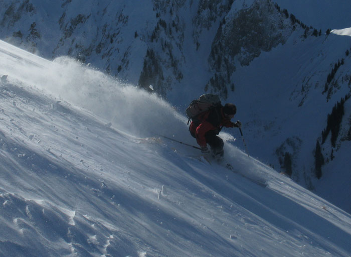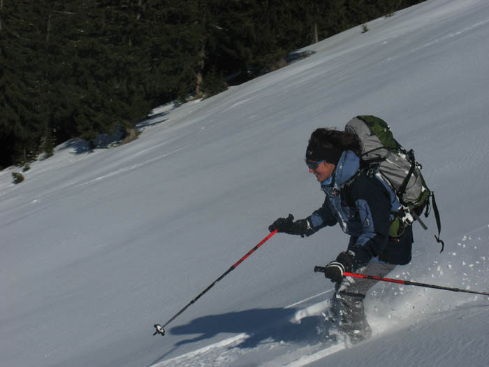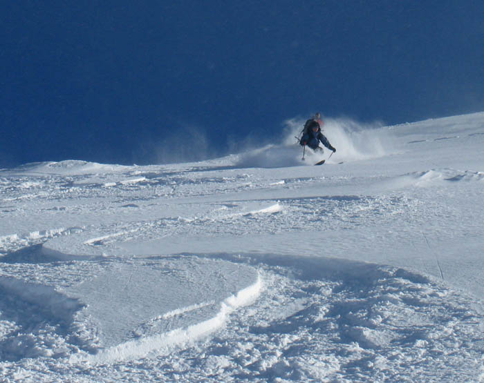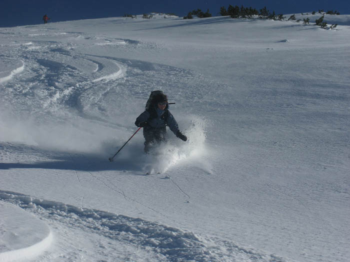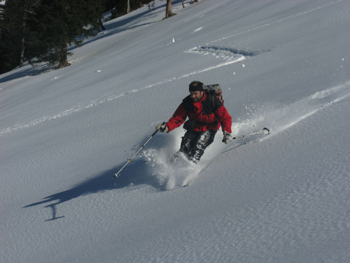 Abfahrt wieder mal sehr spassig, wenn auch an einigen Stellen durch den Wind schon nicht mehr ganz gleichm,äßig unbd im steilen Wiesnhang nur noch wenig Untergrund.