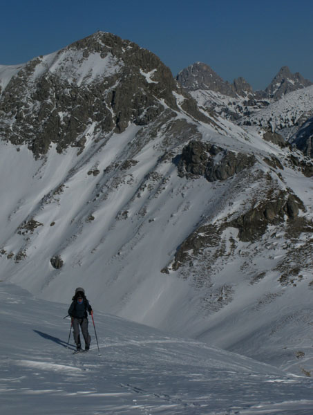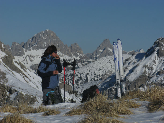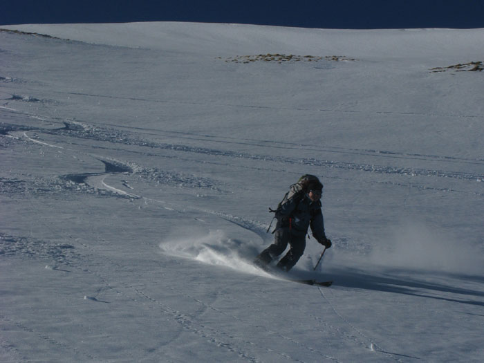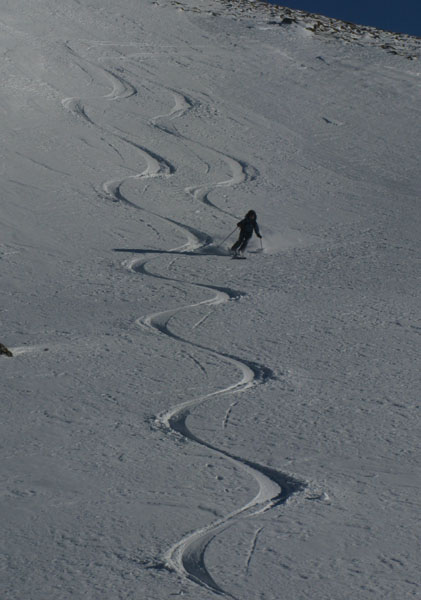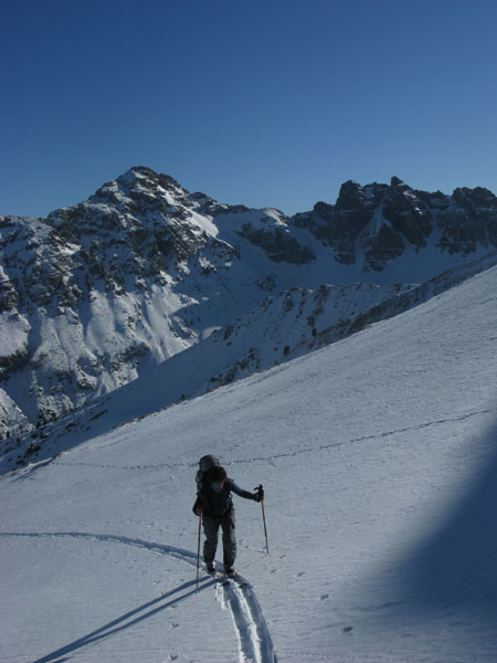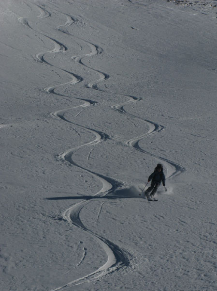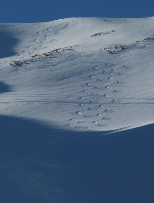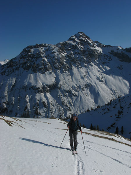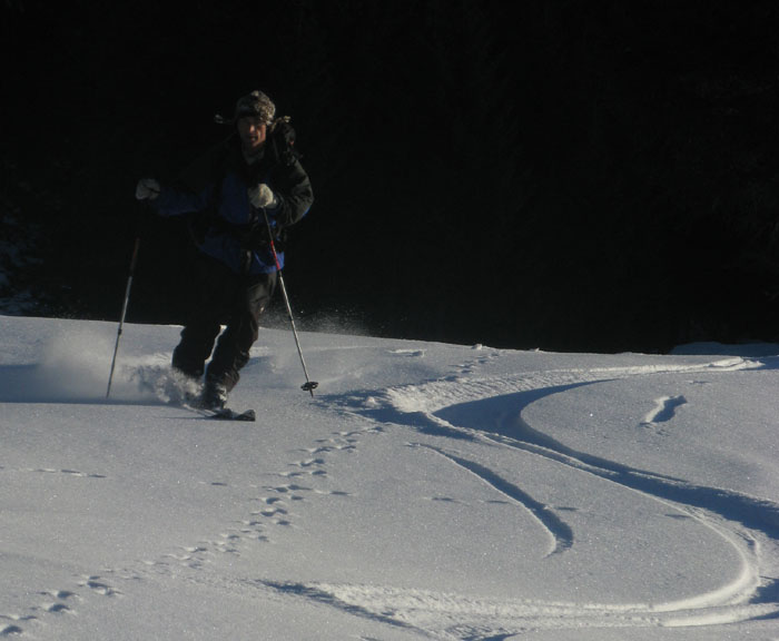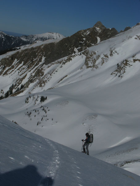 Es wurde neuer Pulver versprochen, doch im Aufstieg war es nur schattig und holzig. Erst die Hänge oben raus versprachen mehr Abfahrtsgenzss, so ostseitig runter in die Mulde und kleines refelling auf die Gesenwangalm. Noch ein paar nette Schwünge, bevor es über Bruchharsch und Schatten wieder hinunterging Richtung Tal