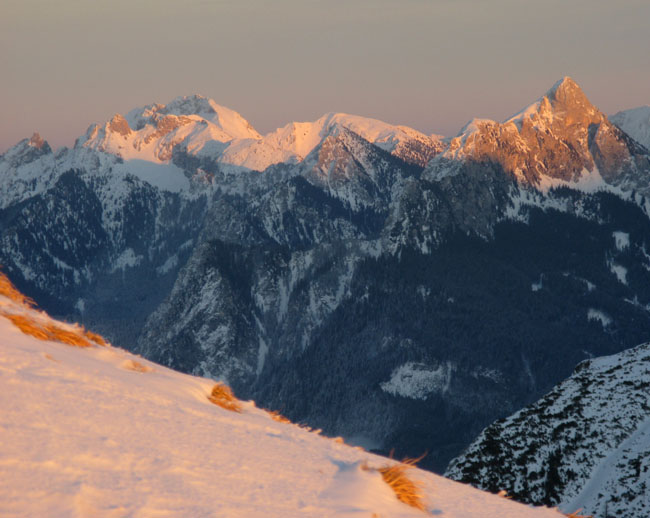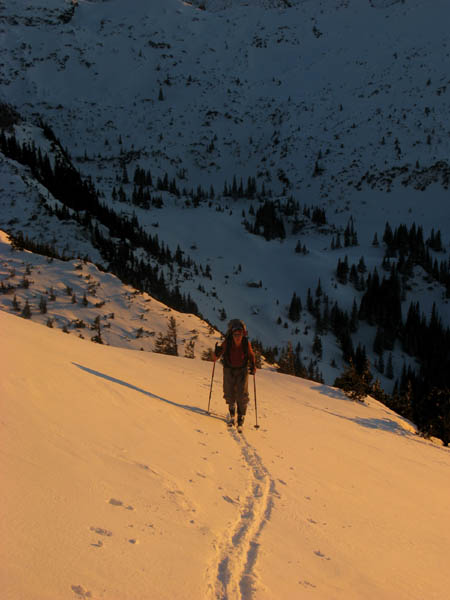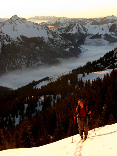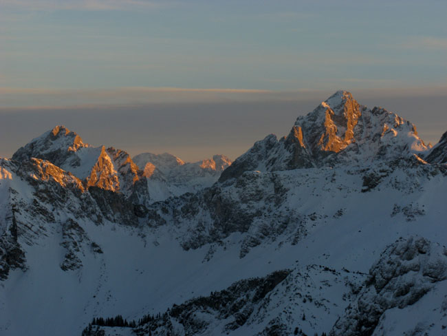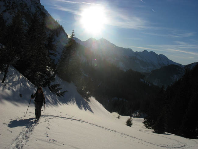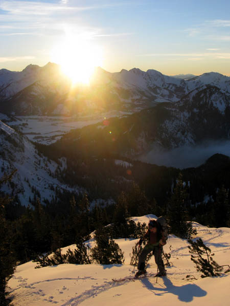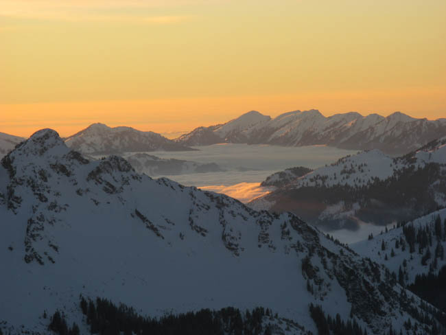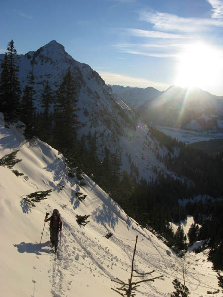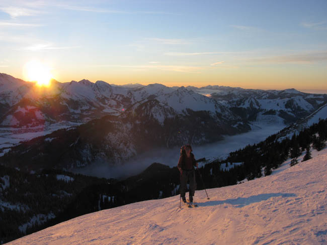 13.01. Vormittags keine Zeit, doch dann entwickelt sich aus der Verlegensheit - Nachmittagstour ein Fest des Lichtes. Leider doch 15 min zu spät oder zu langsam für den Gipfel, und die Abfahrt war auch nur eingeschränkt genussvoll, dafür aber interessant.