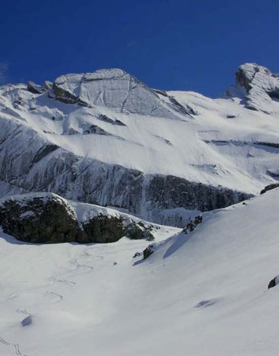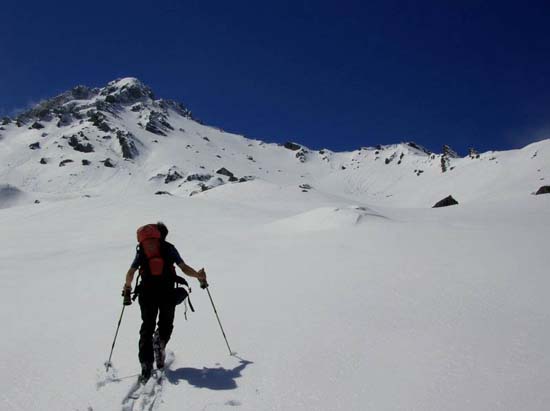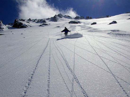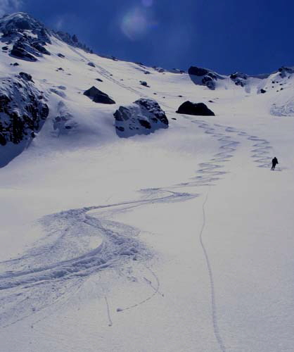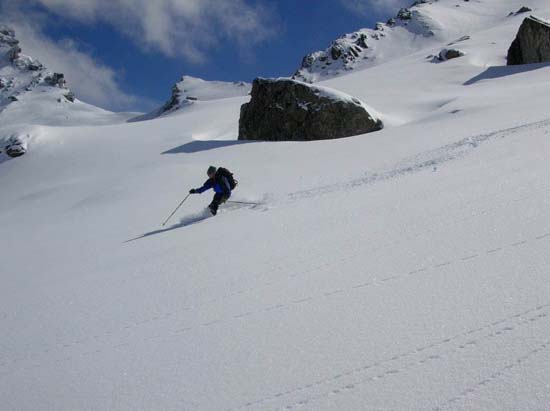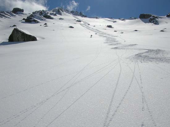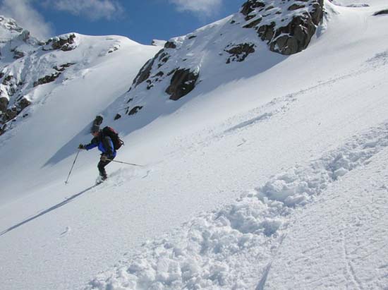 Nach der Larsennscharte zogen wir nochmal die Felle auf, denn der große Hang unter der Schlenker- Nordschulter versprach nochmal Pulver.