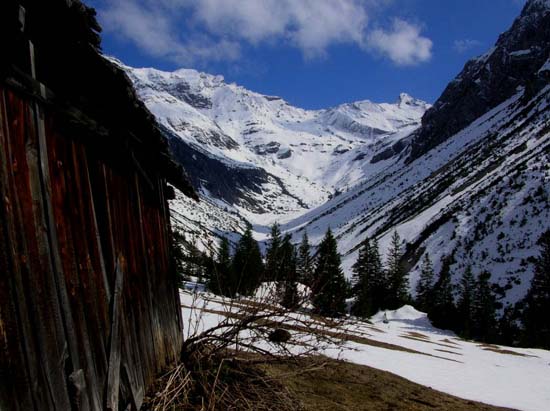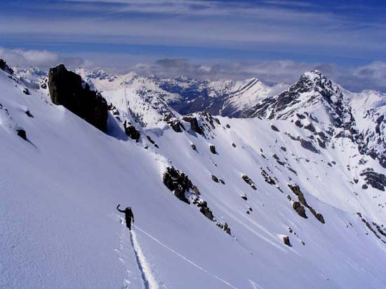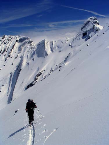 Das erste Stück war der Schnee schon schwerer, aber als weiter oben die Hänge steil und nordseitig wurden, war da wieder Pulver. In dem maße, wie der schnee trockener wurde, wurde er allerdinsg auch tiefer, der Puls blieb hoch. Das letzte Stück in gut 30cm spurend ließen wir es dann am höchsten Absatz kurz unter dem Nordvorbau gut sein.