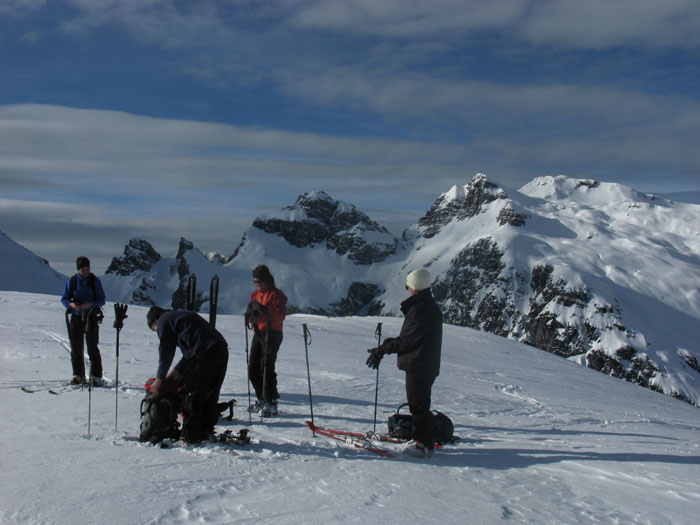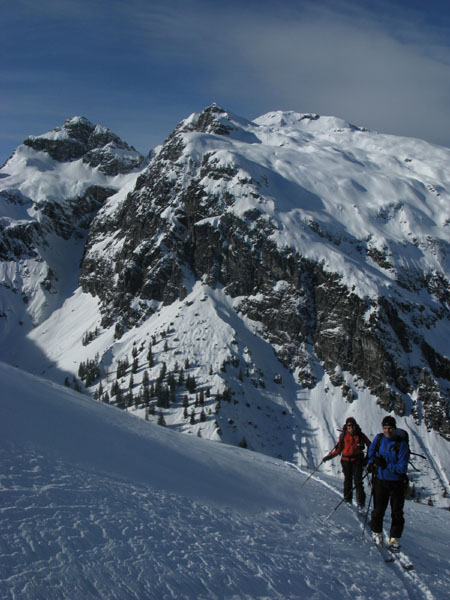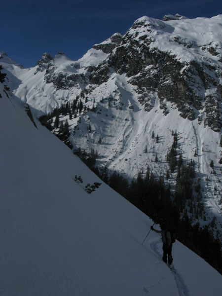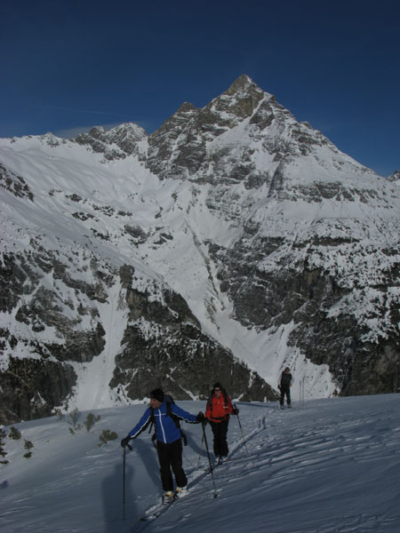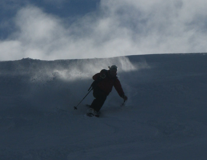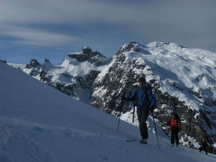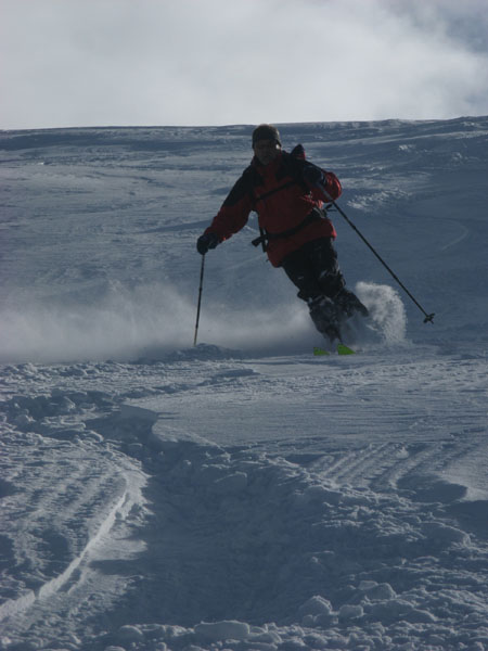 Damian zeigt uns in allen Geländebereichen, dass man uns auch mit Telemarkskiern die Ohren wegfahren kann.