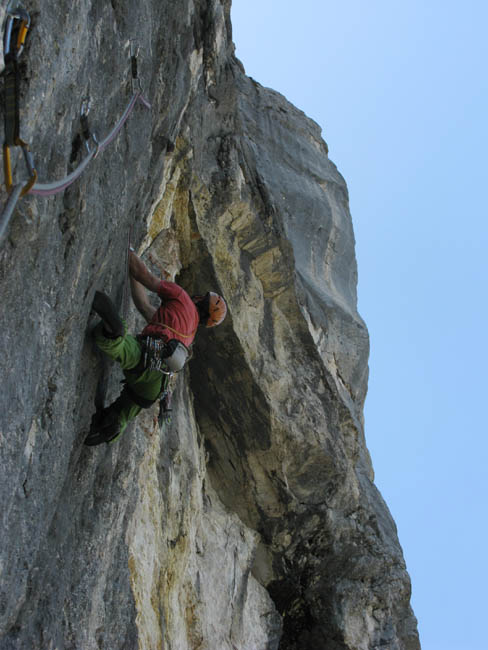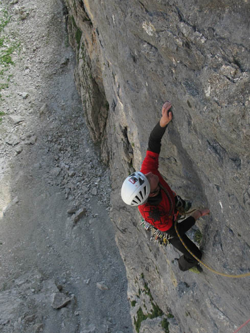 Dann noch an der Westpfeiler der Roten Platte überm Alperschon, jetzt auch die Seillängen der Headwall vorgestiegen