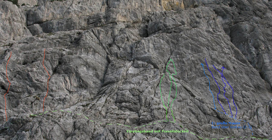 grün .an der Ecke mit dem Fixseil: Kubilai Khan(Nr 20, rechts von dem Riss) 28m, 7, - plattig, oben raus ins schrofige wäre noch ein BH angenehm Chöd (Nr22) mit Verlängerung über die Bolle 42m, 7, vor allem unten sehr genussreich Sakaya (Nr 23), 40m 8-, unten schön an stumpfen Kompaktpfeiler, nach Band auch sehr gut, aber leider stecken die Haken zu weit links und vom Band weg ist einer kaum vernünftig einzuhängen, wenn ohne Exe