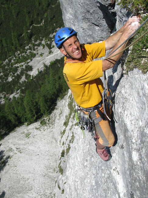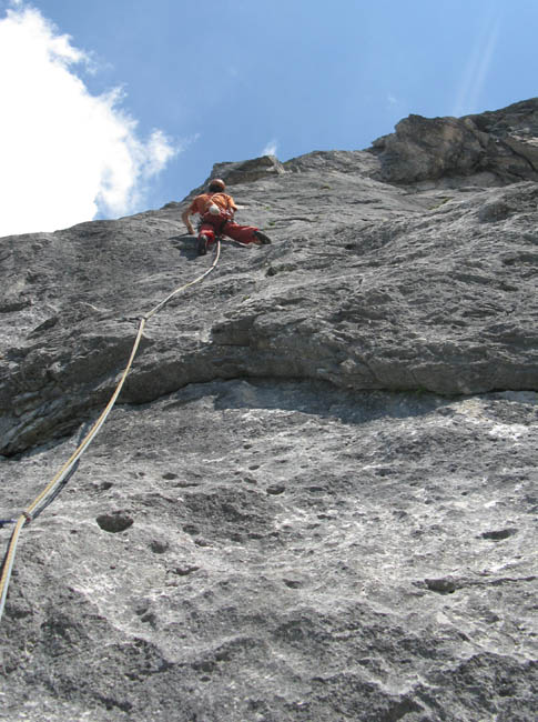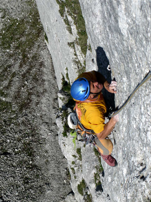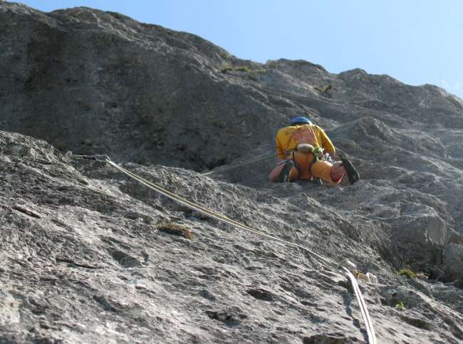 Obewn: Dieter nach den zähen Zügen aus der Gufel raus mit Kurs auf die Passage, in der wir auf 1,4m keine Freikletterrmöglichkeit gefunden haben, der rest ist auch sehr gute Kletterei (ca 8 und 1 x A0)
