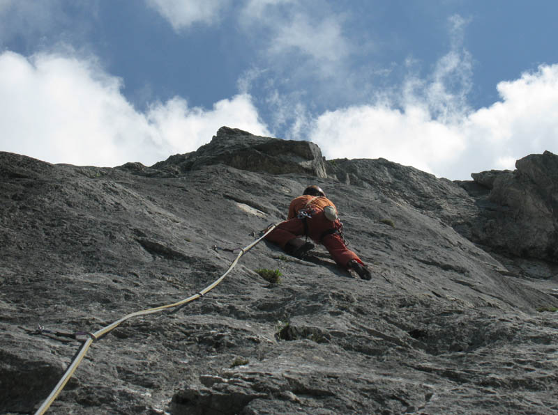 links und unten: auch die nächste Länge bietet wieder schöne Stellen, entlang einiger Löcher und einer dünnen Schuppe (ca 8-). Danach geht´s dann unvermittelt weit links rüber und in die Ausstiegsverschneidung der “Stimmungswechsel” (lange Seillänge, viele exen). (Da ginge sicher auch was gerade weiter einem schönen Pfeiler entlang).