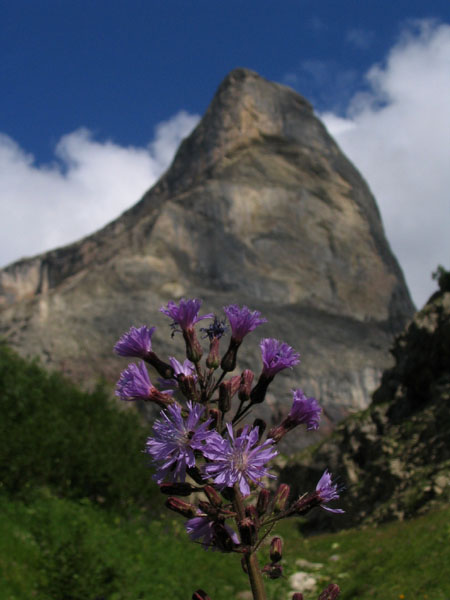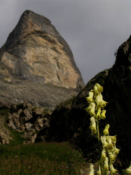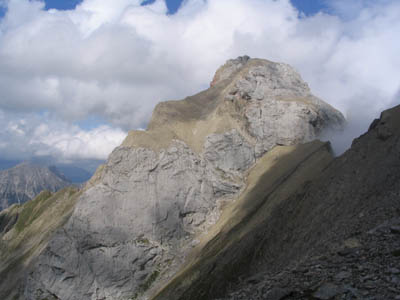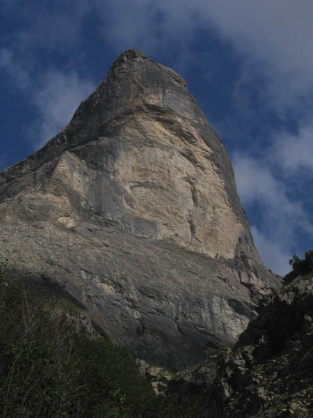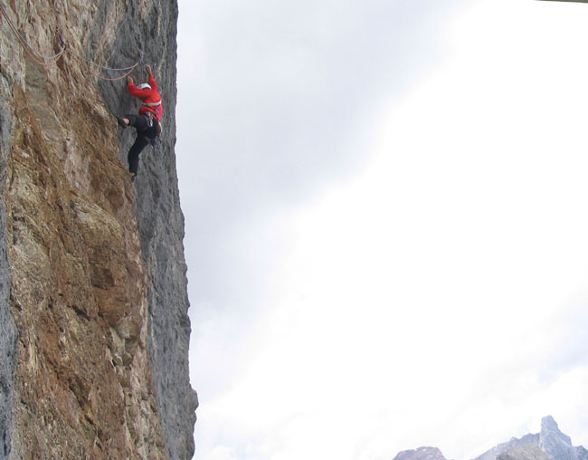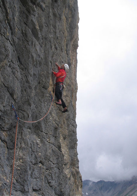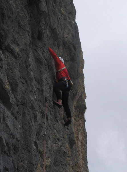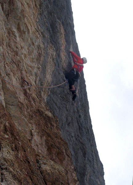 Unten rechts. Die 11 Seillänge (8-) beginnt wieder mit einem luftigen Quergang und zieht dann in einer großen Scheife durch die Wand. An einer Wandstell mit ganz dünnen Einlagerunge darf noch mal richtig zugebissen werden (links halten), dann geht es ständig anstrengend den die kompakte Wand hinauf auf der Suche nach henkelschlitzen und dem nächsten Haken, den man sich manchesmal ein wenig näher her wünscht. Bei uns fing es hier leicht zu regnen an un der kalte böige Wind legte nochmal zu