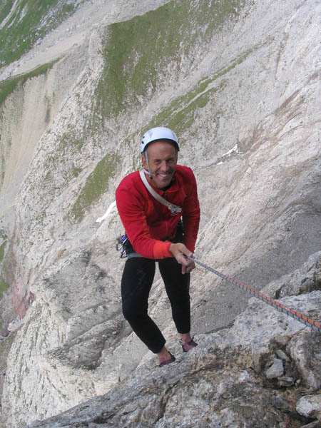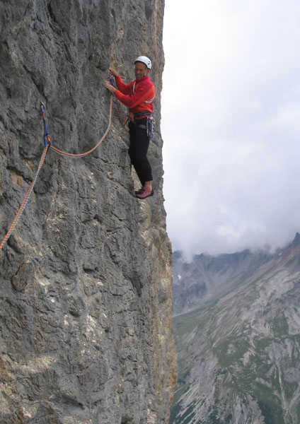 Headwall - mit das Beste im Lechtal Seilänge 10. (8, Schlüsselseillänge) Dieter am Beginn der Schlüsselpassgae, mit schlechten Auflegern erst mal rechts rüber, dann wieder eher linkshaltend weiter zu besseren Griffen. (Bild unten links ). Wenn der übernächste Haken anstrengend geklippt ist, kommts recht kleingriffig oder ein bisschen tricky nach links (Untergriff). Dann heisst dranbleiben und die längeren Abstände auch mit anschwellenden Ärmeln cool wegstecken, irdgendwo kommt schon immer was.