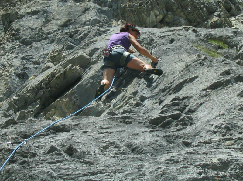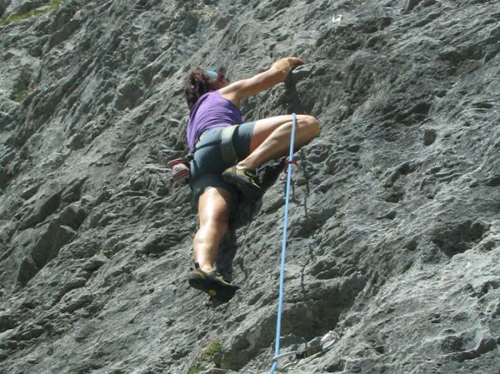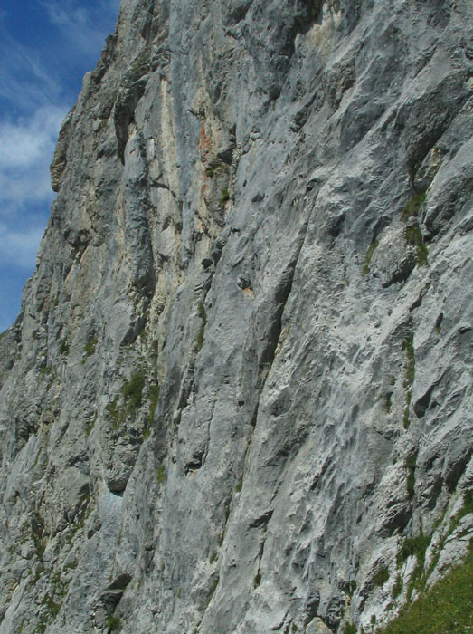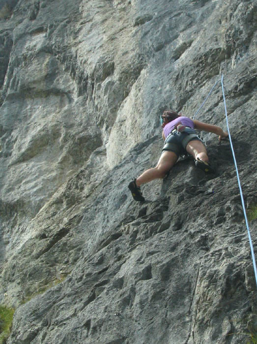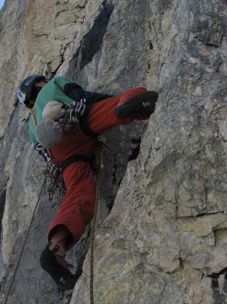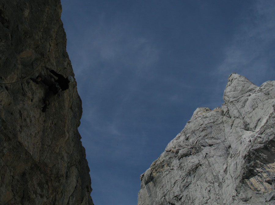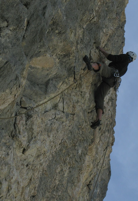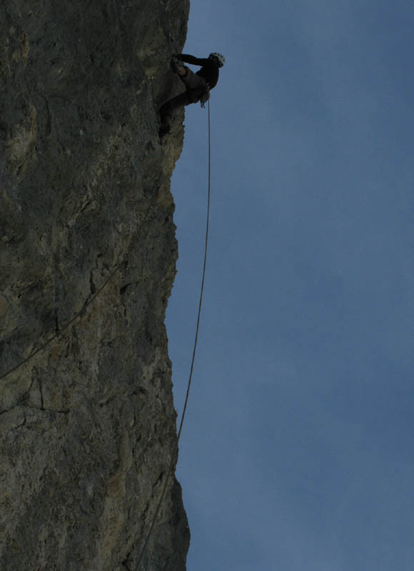 oben und unten: Andi in der steilen 5. Seillänge. Offensichtlich ist mir der Zapfen böse wegen der mangelnden Zuwendung von meiner Seite - auf jeden Fall wirft er mich in der 2. Seillänge nach der Schlüsselstelle mittels feuchten Griffen einmal sauber ab - da ist´s mal vorübergehend vorbei mit der entspannten Athmosphäre. Danach gewöhnen wir uns so allmählich wieder aneinander, vor allem, da Andi in den schweren Seillängen das spitzige Ende des Seiles eingebunden hat.