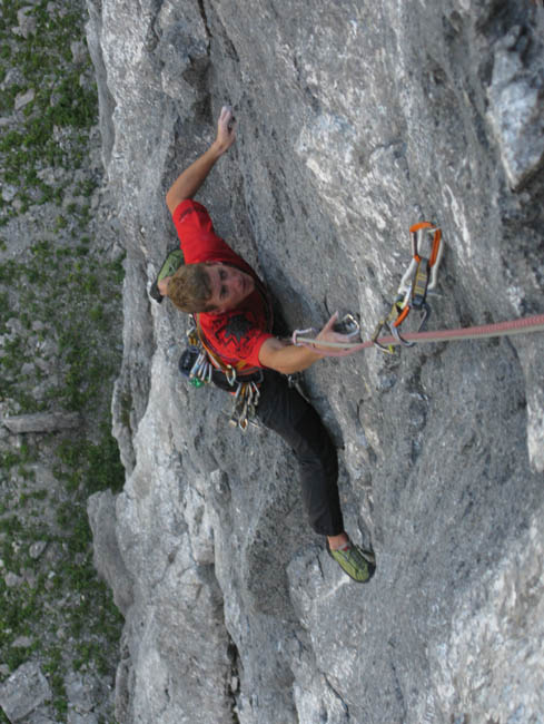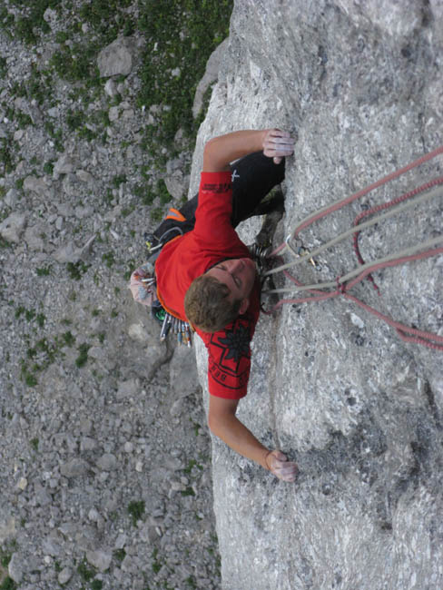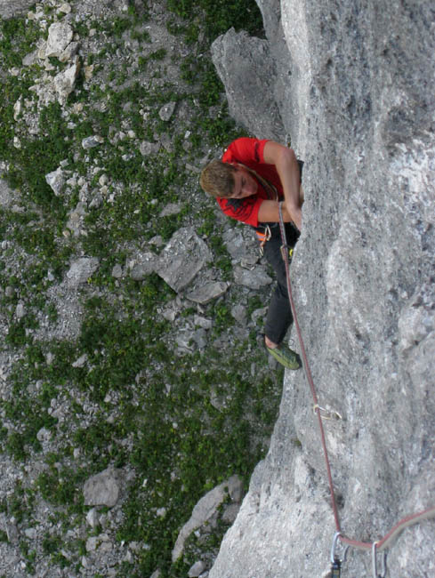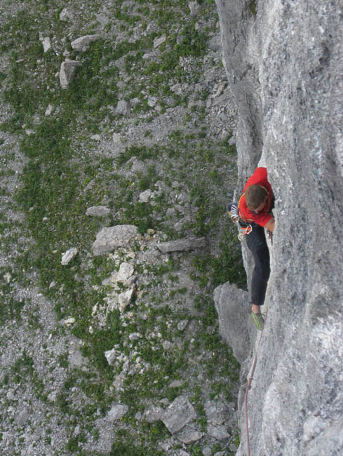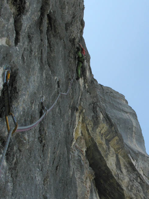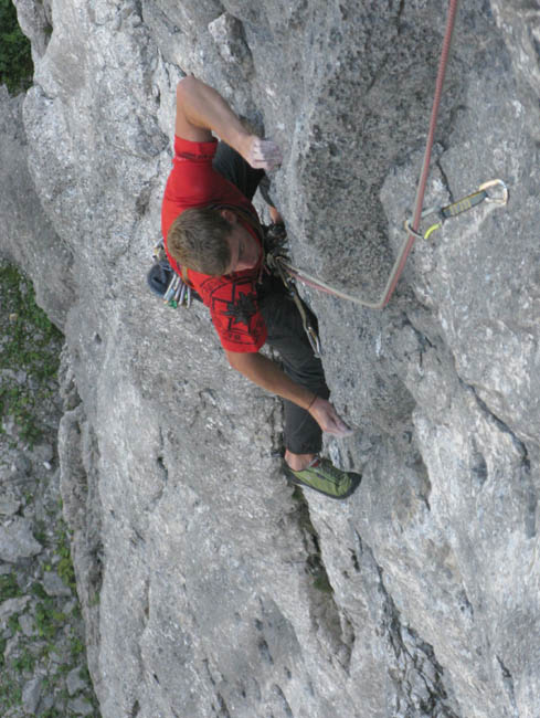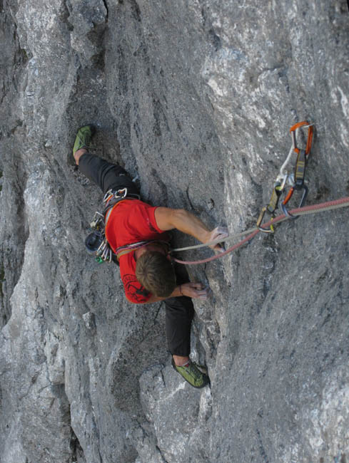 Die 4 te Länge beginnt mit einem pumpigen Quergang an Untergriffen, bevor einen ein weiter Zug in einen 2ten Teil an Löchern entlässt, danach gehts an erodiertem Fels besser weiter zum Stand