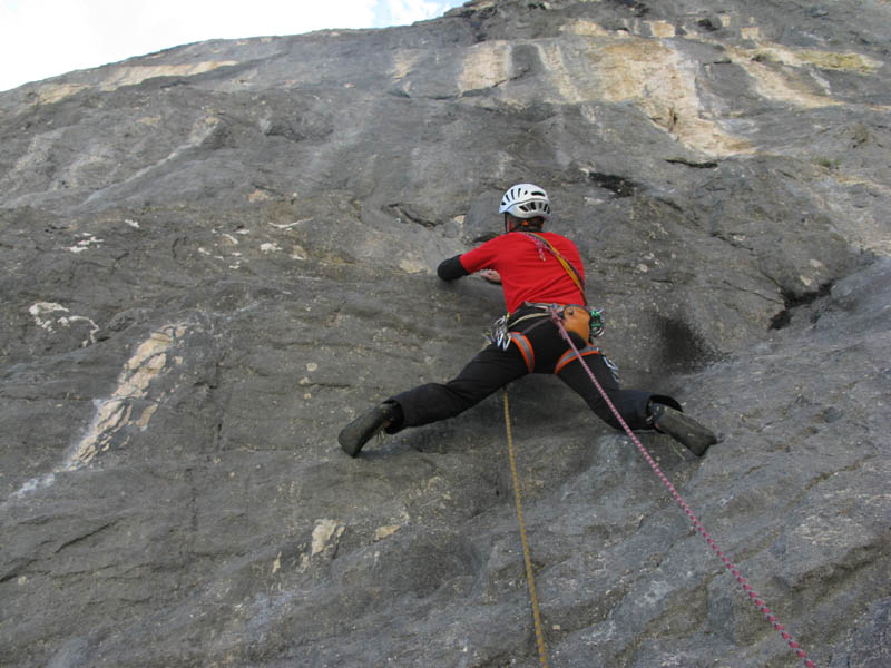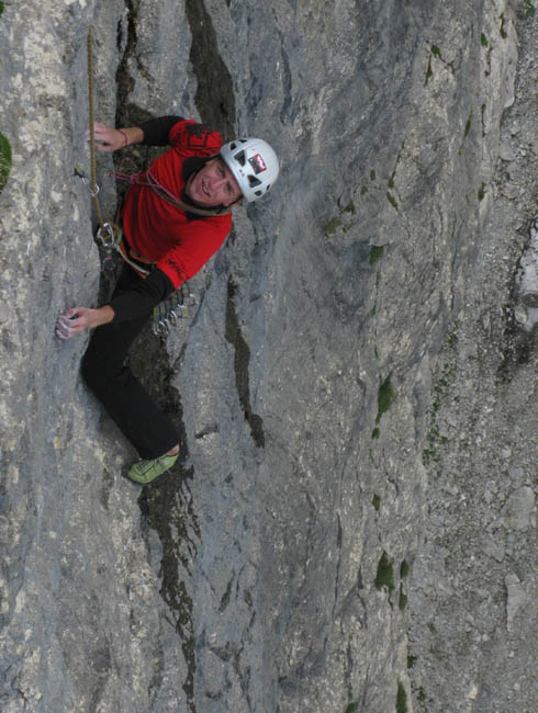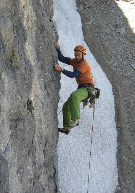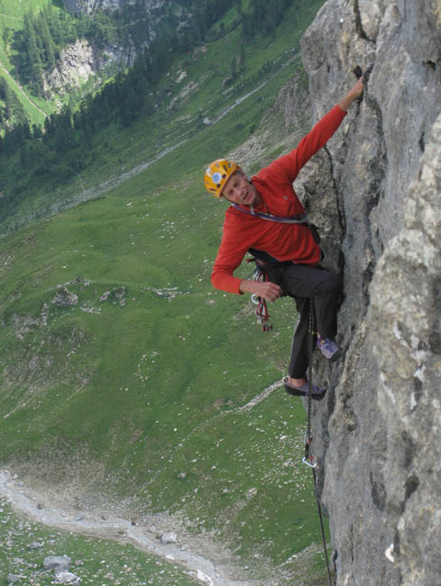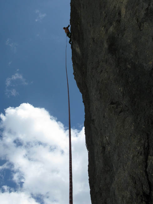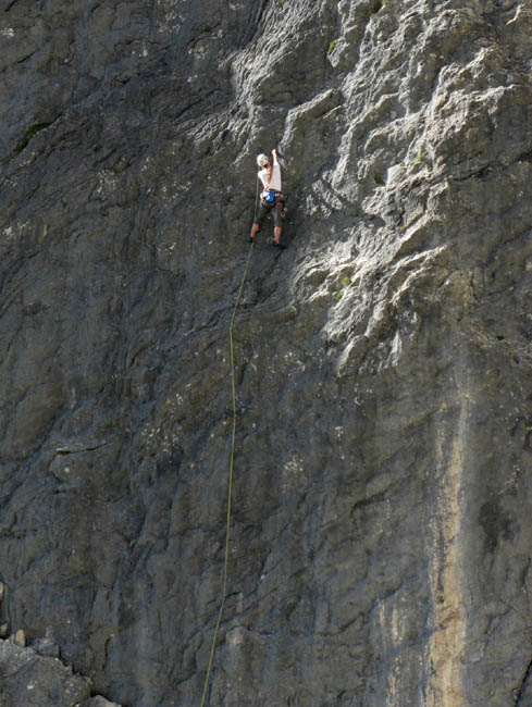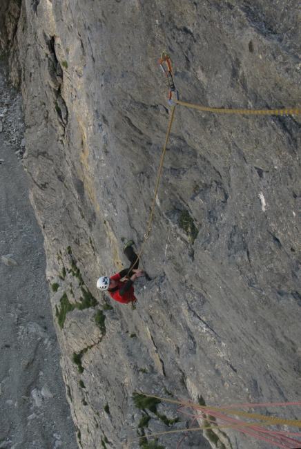 Nach dem Abseilen gibt Stefan mir die Chance, eine alte offene Rechnung mit der ersten Seillänge zu begleichen. Ich bin zwar nun gut warmgeklettert, aber gleichzeitig auch schon gut vorgeplättet, so dass es ein enges Rennen wird, ziemlich knapp rette ich mich raus in den etwas einfacheren oberen Teil. Während in der Ville Treppte schon der Kocher surrt und Kaffe gekocht wird, machen wir uns dann sehr zufrieden auf den Abstieg.