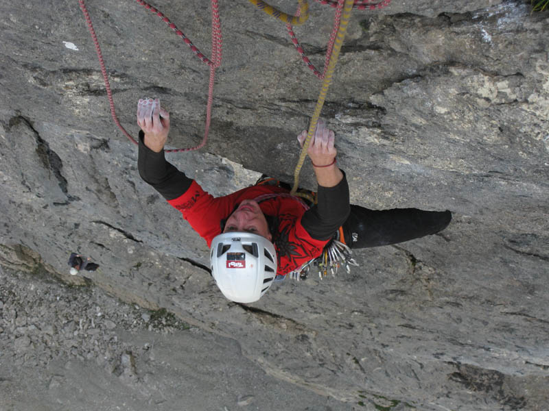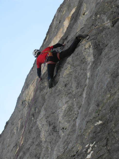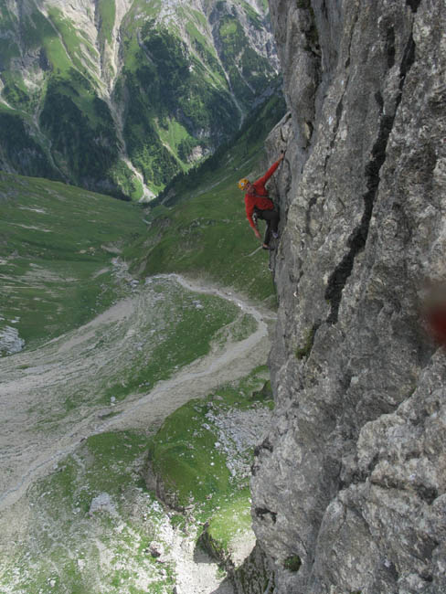 nach relativ kurzweiligem Zustieg laufen wir am Wandfuß ein, als gerade 2 Seilschaften vom Boden abheben. Es braucht etwas, bis wir sie als die alten Freispitzveteranen Wolfi Mayr (mit Antje in “Ohne Heel” ) und Rainer Treppte (mit ? in Zone 40) identifizieren: Dann geht´s für uns auch gleich herb los, die erste Passage der Zone 90 ist ein veritabler Kaltstart in die schwersten Züge der Route. Ich komm zwar diesmal relativ weit, hänge aber schlussendlich doch. Dafür pfeilt Stefan ohne Hänger die Seillänge durch und mir gelingt die nächste mit ihren weiteren Abständen trotz fehlender Alpinadaption ganz ordentlich. Wir kommen gut voran, nach der kurzen 3. Seillänge bekomme ich das Gustostück der Tour, die lange 4. SL mit etwas kniffligem Statr und dann anhaltenden, wunderbaren Felsstrukturen. Die 5. SL ist etwas gemütlicher, die 6. geht lange gut dahin, bis dann am Wulst oben einige härtere Züge beherztes Zupacken erfordern. Auch wenn man dann die gute Schuppe hat, ist´s noch nicht ganz gegessen, denn es ist verdammt steil (nicht rechts raus, sondern gerade und in den Untergriff kommen ist die beste Lösung)