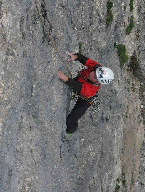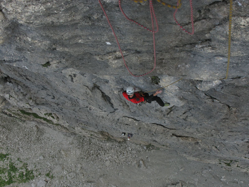 Links: 6. SL, mit einer langen Schleife und dann über den Wulst unten Stefan nähert sich dem Wulst, (unterhalb Rainer in der Schlüsselseillänge der Zone 40), dann nach dem schweren Beginn in den Wulst rein oben raus noch 1 x kleinere Leiste ziehen, dann kommen wieder die typischen Henkel.