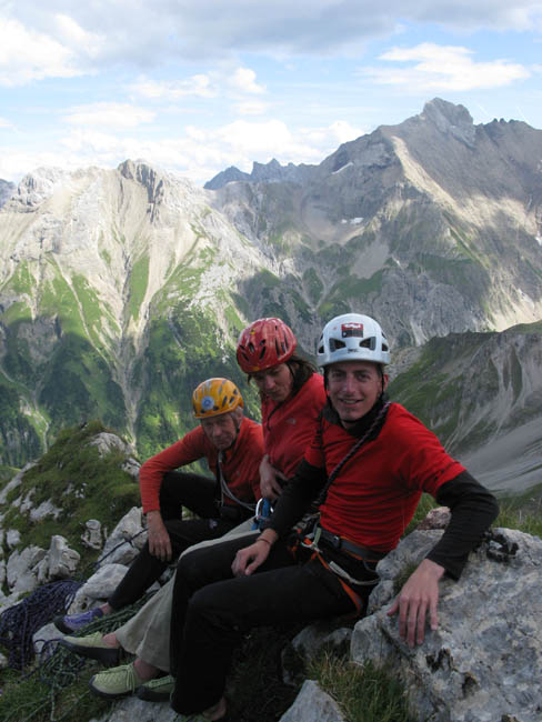 Als Stefan nachkommt, taucht auch drüben der Mayr Wolfi auf in der “Ohne Heel und Tadel”aus der Tiefe auf. Da Stefan die letzte SL auch zügig hinter sich bringt, sind wir dann die ersten am Gipfelsteinmann. Bald gesellt sich Wolfi dazu und so gibt´s einen gemütlichen Plausch oben und Unterstützung beim Abseilen.